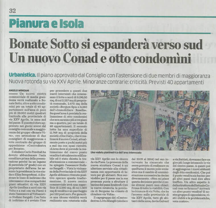 Bonate Sotto si espande verso sud: approvato il piano per il nuovo Conad e otto condomìni. Il progetto prevede un punto vendita moderno da 1.500 mq e un parcheggio da 150 posti auto, per offrire più servizi e opportunità di lavoro alla comunità. Leggi l'articolo